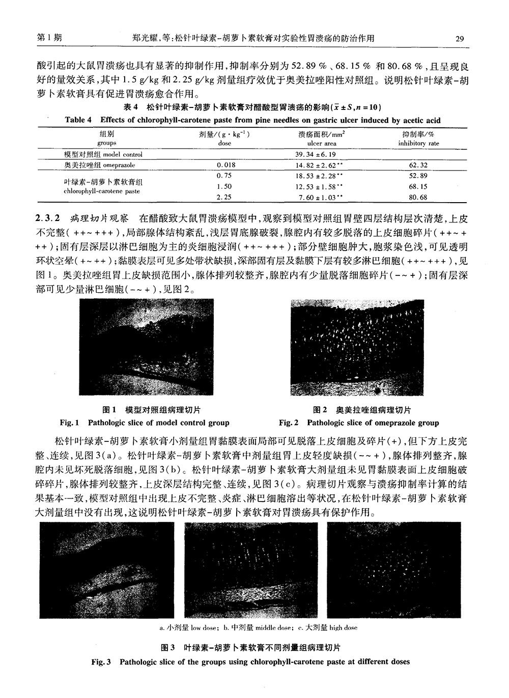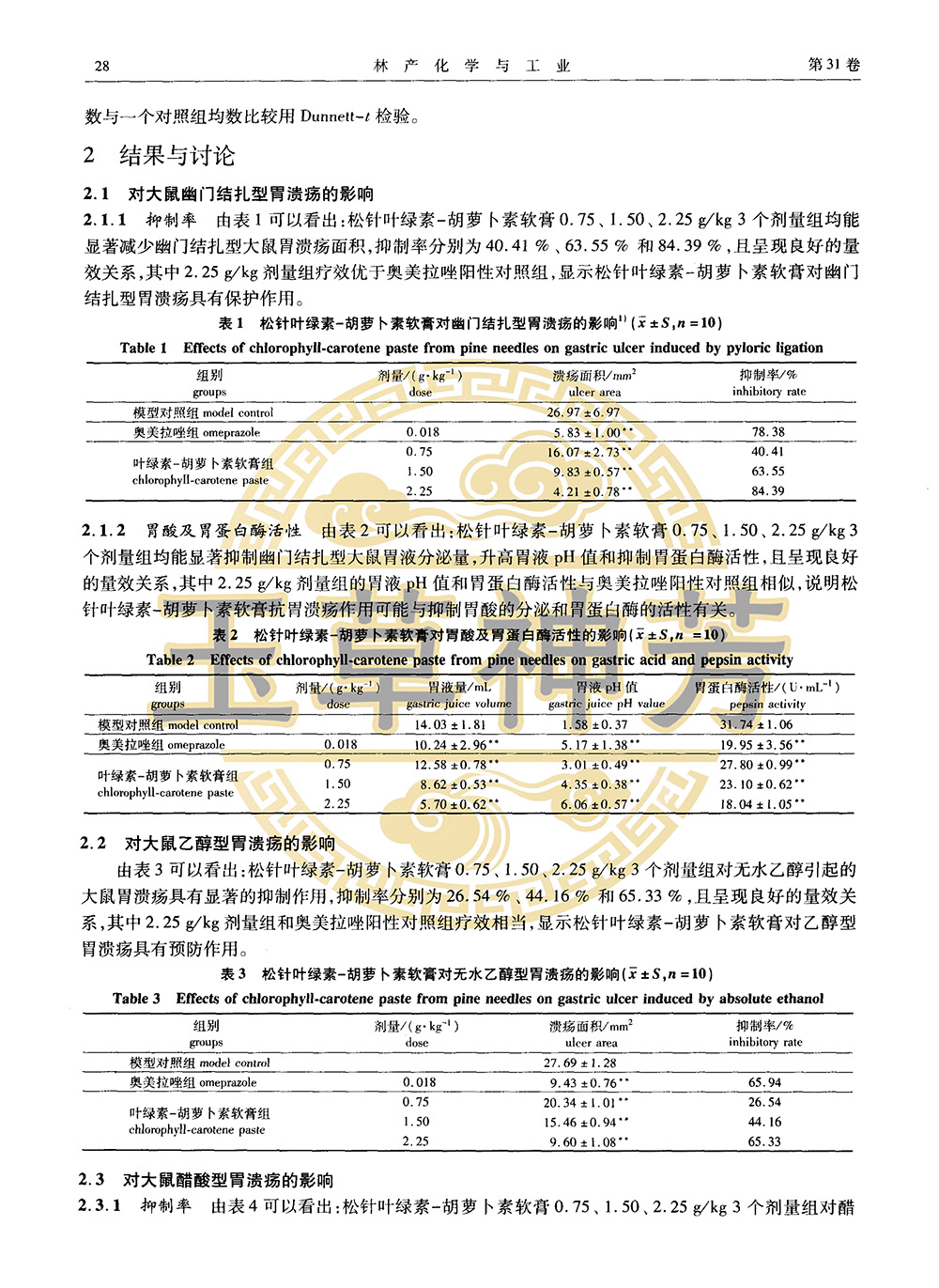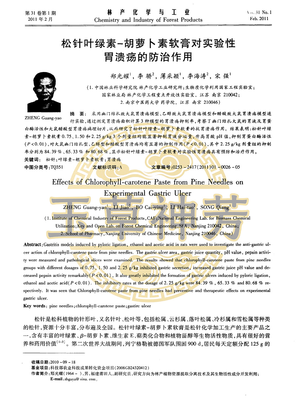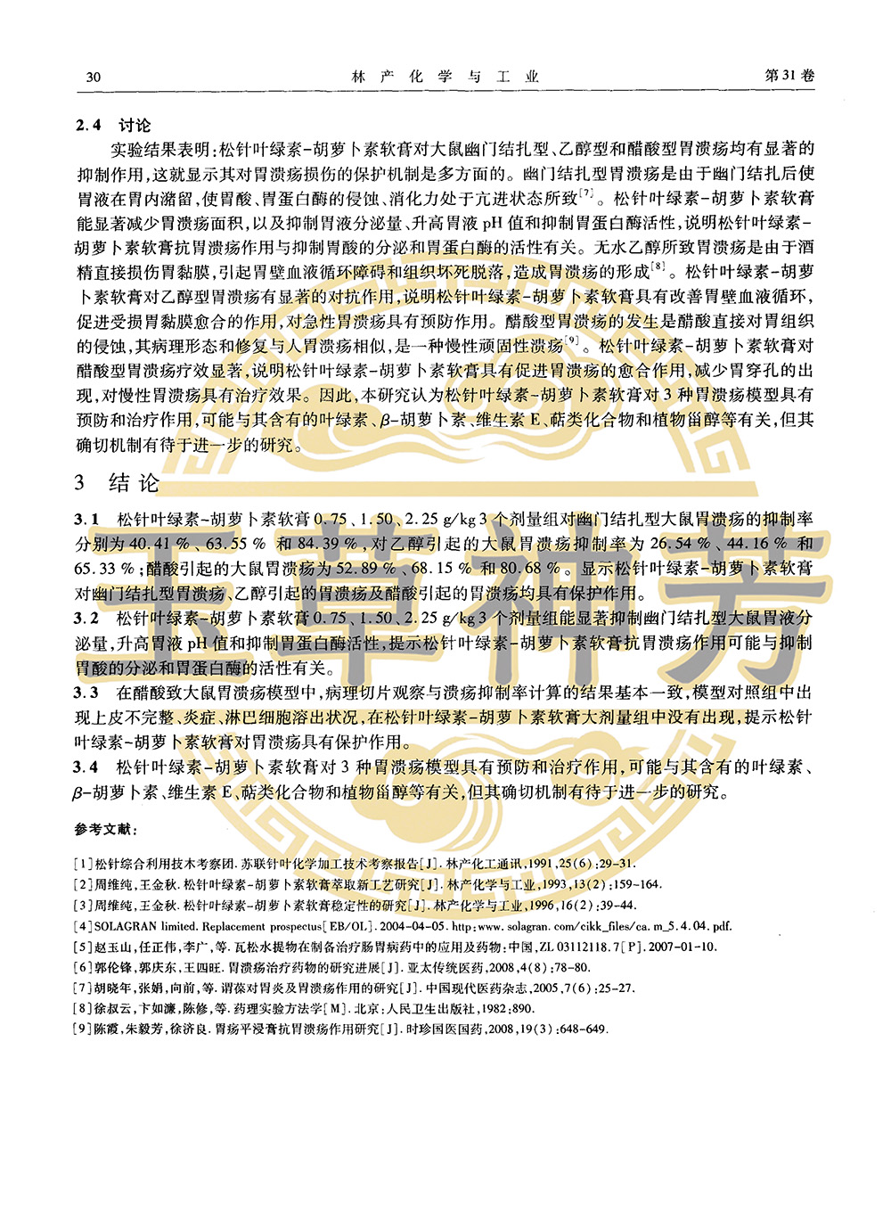 王经洋等[44]以革兰阳性菌、革兰阴性菌及致病真菌为供试菌,检测了松针对病原菌的抑制效果。研究结果表明,松针的水、乙醇、醋酸乙酯提取物均有较广的抑菌谱,对金黄色葡萄球菌、藤黄微球菌、肠球菌、耐药大肠杆菌、志贺氏杆菌、沙门氏菌、须癣毛样菌、石膏样小孢子菌、犬小孢子菌均有很好的抑菌效果,尤其对革兰阳性菌及3种皮肤癣致病真菌有较强的抗菌活性。郑光耀等[45]采用琼酯稀释法测定松针叶绿素胡萝卜素软膏对15种革兰阳性菌、革兰阴性菌和真菌的最低抑菌浓度(minimum inhibitory concentrationMIC)。结果表明,松针叶绿素胡萝卜素软膏对革兰阳性菌的MIC0.61.6 mg/mL、革兰阴性菌的MIC1.03.0 mg/mL、真菌的MIC1.54.1 mg/mL,提示松针叶绿素胡萝卜素软膏具有广谱的抗菌作用。又将其结果与其他实验结果相比,发现松针叶绿素胡萝卜素软膏对革兰阳性菌、革兰阴性菌和真菌的抑制作用优于松针水提物和醇提物。采用试管倍比稀释法观察到松针叶绿素胡萝卜素软膏对幽门螺杆菌的MIC132,最低杀菌浓度为18,证明松针叶绿素胡萝卜素软膏具有较强的体外抑制幽门螺杆菌的作用[46]