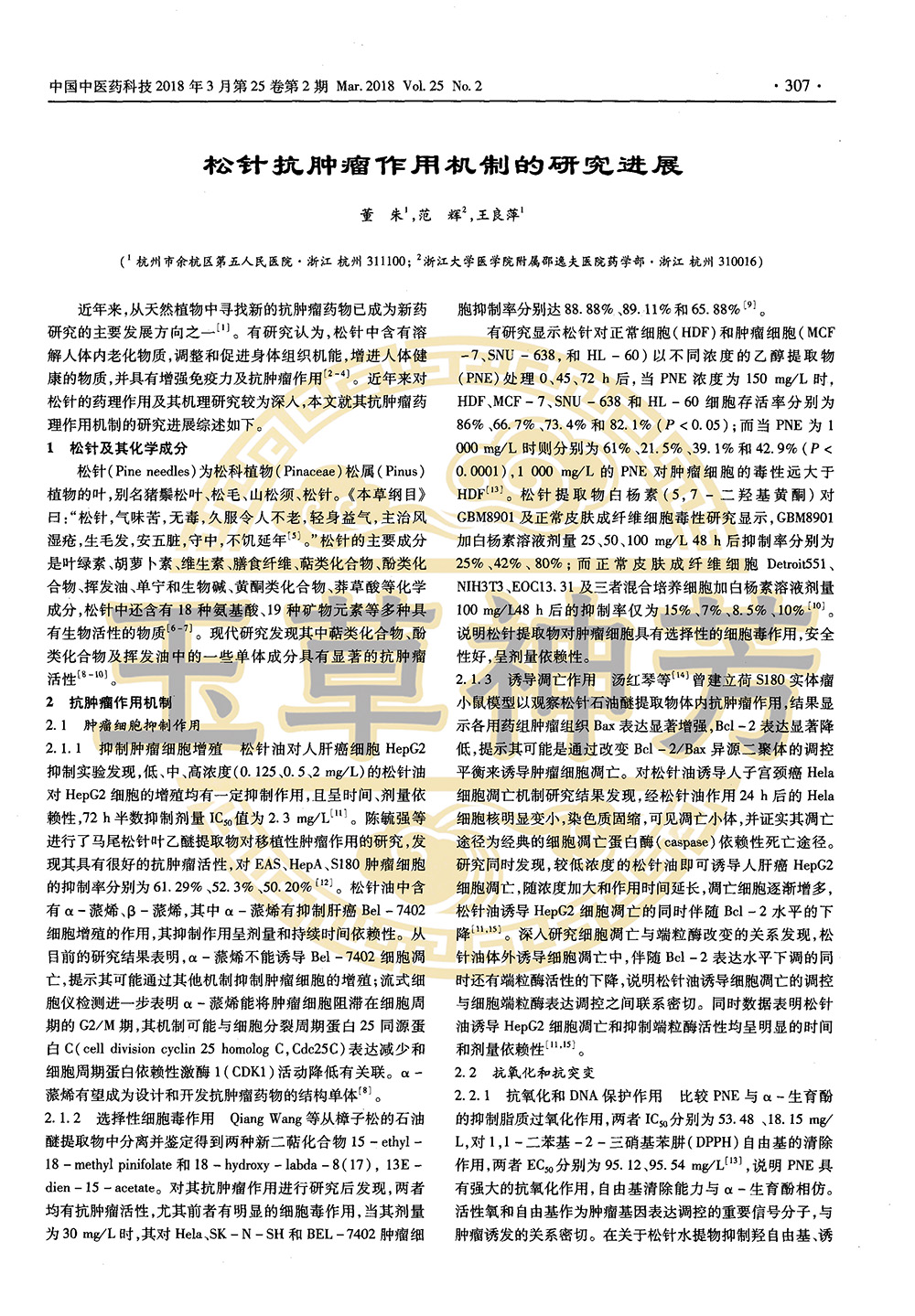 郝凯华等[41]发现雪松松针总黄酮能够体外抑制不同肿瘤细胞增殖,并具剂量相关性,但该作用较平缓。随雪松松针总黄酮浓度升高,人肝癌HepG2细胞停滞于G 0 /G 1 期比例呈增加趋势,凋亡率亦逐渐升高,并呈现剂量相关性。李师等[42]发现雪松松针总皂苷对人肺癌A549细胞、HepG2细胞和人胃癌MKN45细胞的增殖均有较强的抑制作用,其中尤以对A549细胞抑制作用最强;雪松松针总皂苷120 µg/mLA549细胞的增殖抑制率可达71.29%。雷艳萍[43]发现雪松松针提取分离的总木脂素对5种肿瘤细胞的增殖均有较强的抑制作用,抑制作用从强到弱分别为A549细胞>人宫颈癌HeLa细胞>HepG2细胞>人结肠癌HT-29细胞>MKN45细胞;从中分离得到的木脂素单体蛇床子素对5种肿瘤细胞的增殖也有较强的抑制作用,抑制作用从强到弱分别为A549细胞>HepG2细胞>HT-29细胞>MKN45细胞>HeLa细胞。