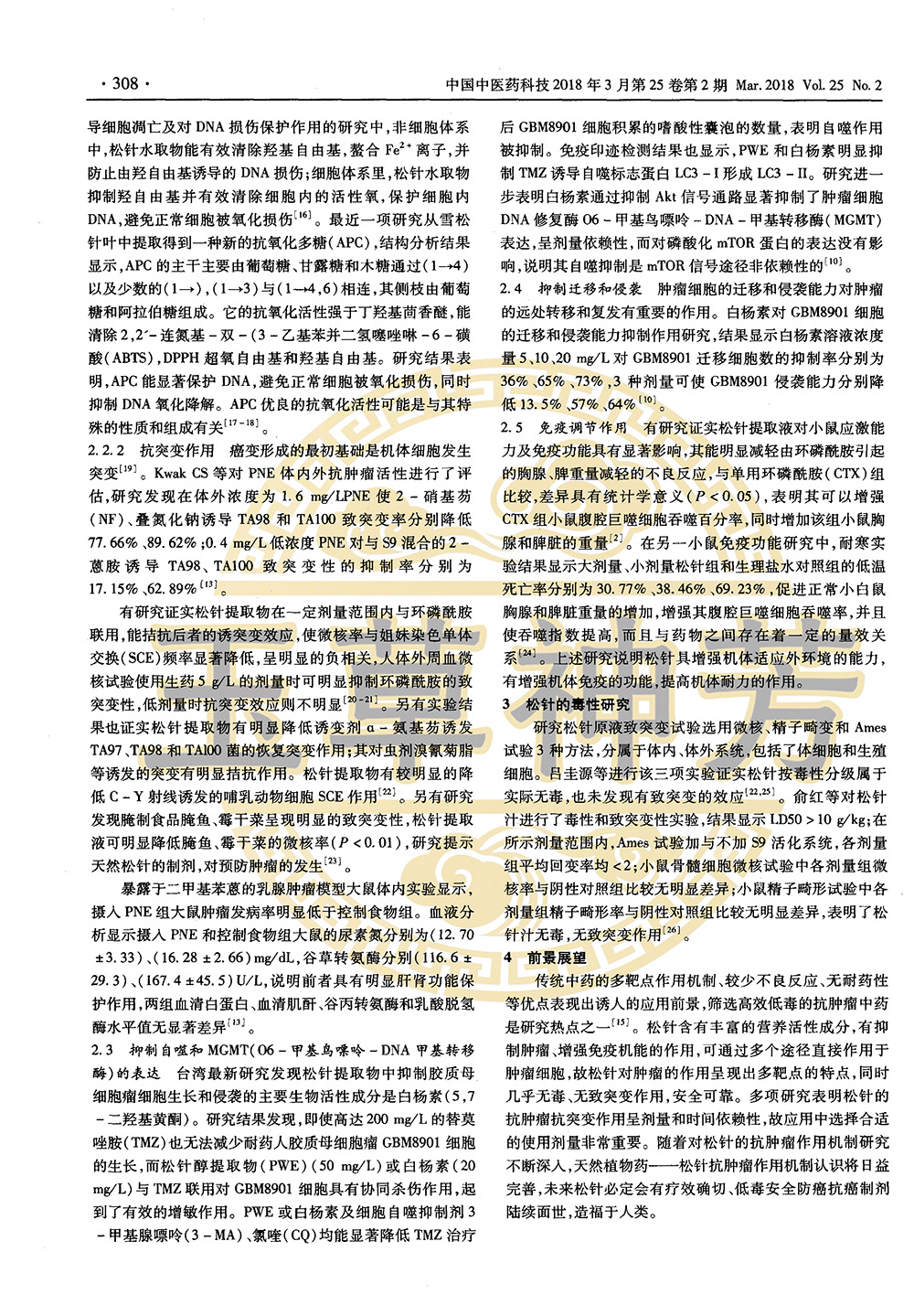 汤红琴等[39]建立荷S 180 实体瘤小鼠模型,ig松针石油醚提取物0.51.02.0 g/kg连续10 d,考察松针石油醚提取物的体内抗肿瘤作用。结果显示,石油醚提取物可显著抑制S 180 肿瘤的生长,且给药组肿瘤组织B淋巴细胞瘤-2B-cell lymphoma-2Bcl-2)表达显著降低,Bcl-2相关X蛋白(Bcl-2 associated X proteinBax)表达显著增强,提示松针石油醚提取物可能是通过改变Bcl-2/Bax异源二聚体的调控平衡来诱导肿瘤细胞凋亡的,由此推测松针石油醚提取物的抗肿瘤作用可能是通过选择性杀死肿瘤细胞、诱导肿瘤细胞凋亡来实现的。郑光耀等[40]利用S 180 荷瘤小鼠探究松针叶绿素胡萝卜素软膏的抗肿瘤作用及其对小鼠免疫功能的影响。实验结果表明,松针叶绿素胡萝卜素软膏600800 mg/kg有显著的抑瘤作用,同时松针叶绿素胡萝卜素软膏400600 mg/kg对环磷酰胺有显著的协同增效作用。进一步通过检测免疫器官指数、血清半数溶血值、廓清指数K和吞噬系数α值来考察松针叶绿素胡萝卜素软膏对免疫系统的影响,结果提示松针叶绿素胡萝卜素软膏的抑瘤作用可能与增强机体免疫功能有关。