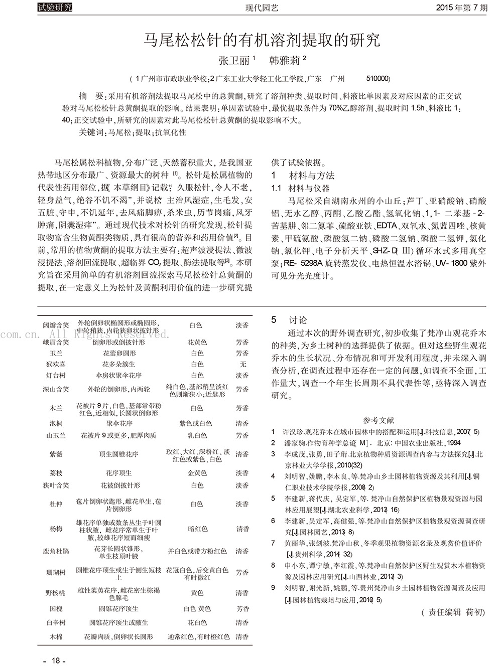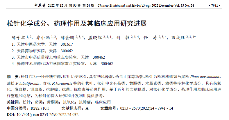 来 源:陈子聿,乔小涵,陈金鹏,盖晓红,刘 毅,任 涛,田成旺.松针化学成分、药理作用及其临床应用研究进展 [J]. 中草药, 2022, 53(24):7941-7954.