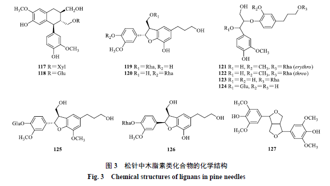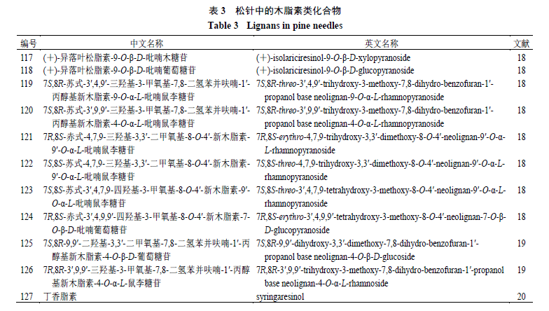 张静娇等[18]利用反复硅胶、聚酰胺、ODSSephadex LH-20柱色谱等方法对红松松针80%乙醇 提取物进行分离纯化,共分离得到8个木脂素类化合物(117124),均为首次从红松中分离得到。李师等[19]从雪松松针95%乙醇提取物的正丁醇萃取物中分离得到2个木脂素类化合物(125126),均为首次从该属植物中分离得到。王东东[20]从雪松松针二氯甲烷提取物中分离得到丁香脂素(127)。各成分具体信息见表3,具体结构见图3