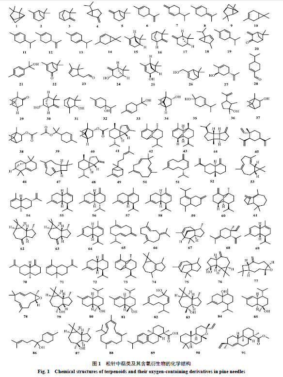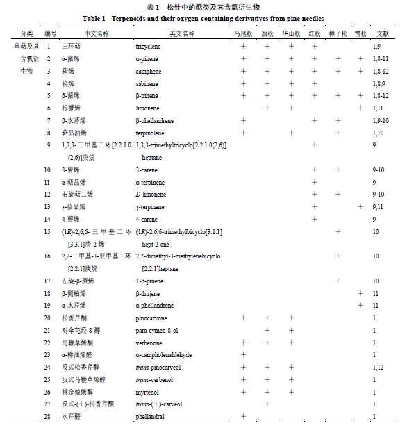 利用水蒸气蒸馏法提取松针中的挥发油,并通过气相色谱质谱联用技术(gas chromatography-mass spectrometryGC-MS)分析发现其成分主要为萜类化合物,包括α-蒎烯、β-蒎烯、莰烯等[1,8-12],不同品种间萜类成分有所不同,具体成分见表1,化合物结构见图1