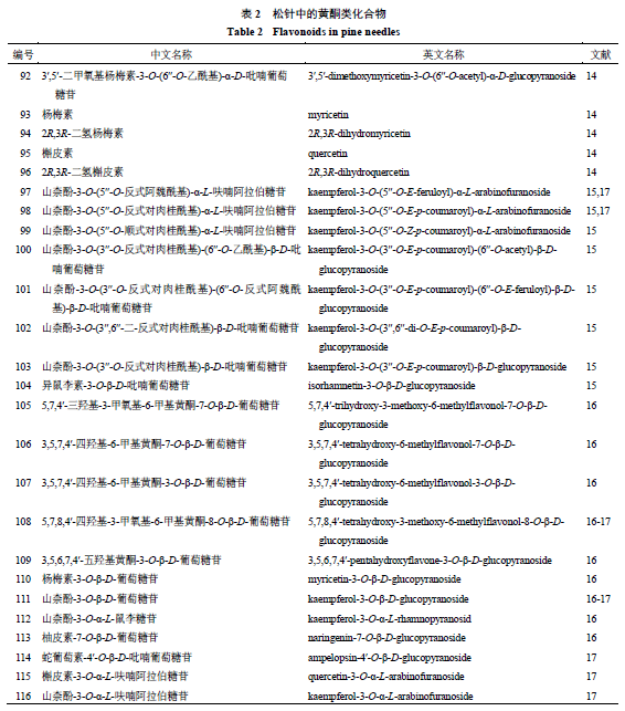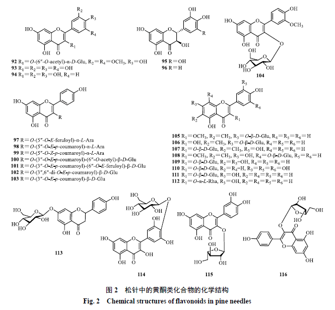 通过研究雪松松针醋酸乙酯部位化学成分发现,其中含有大量的黄酮类化合物,主要为杨梅素、槲皮素、山柰酚及其苷类[13]。刘东彦等[14]采用硅胶、Sephadex LH-20等柱色谱方法对雪松松针醋酸乙酯萃取部位中黄酮类化学成分进行分离和纯化,得到5个化合物(9296)。其中92为新化合物,将其命名为雪松酮A,其余化合物为首次从雪松属针叶中分离得到。钟胜佳[15]从油松松针的乙醇提取物中分离出8个黄酮类化合物(97104),其中化合物97100为新化合物,化合物101103为首次从松属植物中分离得到,化合物102104为首次从油松中分离得到。张春磊等[16]从油松松叶80%乙醇提取物醋酸乙酯萃取部位分离并鉴定了9个黄酮类化合物(105113),其中化合物105106为新化合物,所有化合物均为首次从油松中分离得到。高岩等[17]从红松松针中分离鉴定得到7个黄酮类化合物(9798108111114116),其中化合物114116为首次从松属植物中分离得到,其余化合物为首次从红松中分离得到。各成分具体信息见表2,具体结构见图2