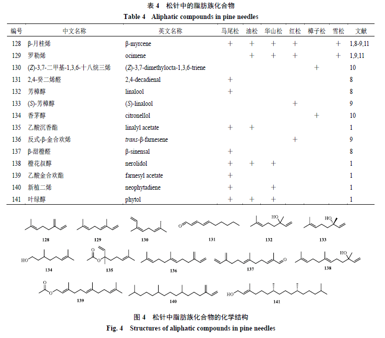 各品种松针中均含有脂肪族化合物[1,8-12],具体信息见表4,具体结构见图4。此外,杨永安等[21]通过傅里叶变换红外光谱仪测定赤松、黄山松、马尾松、雪松松针的光谱图,推断其中含有多糖类、氨基酸类等化学成分。杜鹃等[22]利用火焰原子吸收光谱法分析长白山红松松针,发现其中含有FeK7种金属元素。